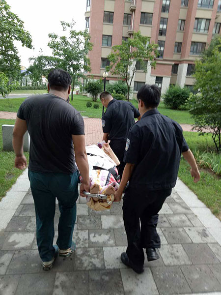此時(shí),業(yè)主大娘已失去了意識(shí),正被醫(yī)護(hù)人員放躺在擔(dān)架上,準(zhǔn)備下樓上救護(hù)車(chē)。兩位保安二話沒(méi)說(shuō),趕緊上前幫著抬起擔(dān)架送上了救護(hù)車(chē),并引領(lǐng)救護(hù)車(chē)快速駛離園區(qū),直奔醫(yī)院。