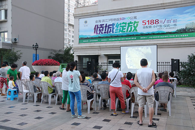 經(jīng)營中心置業(yè)顧問也在現(xiàn)場給觀看電影人員贈(zèng)送電影兌換券,此兌換券可以到濱江3號售樓處兌換電影票一張。