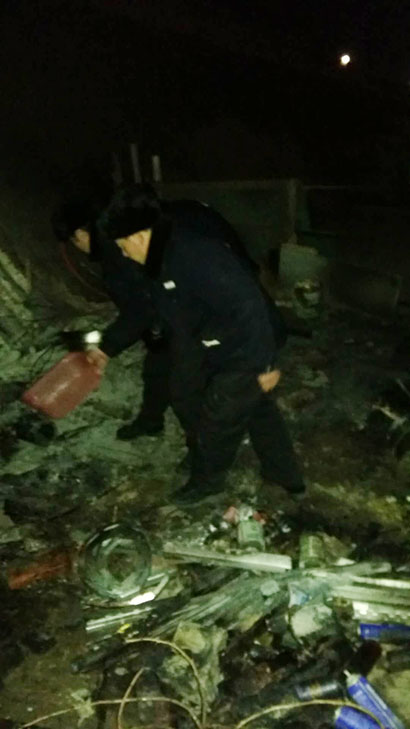 大火撲滅后,消防車和消防官兵都已撤離現(xiàn)場,但金海物業(yè)的工作人員沒有放松警惕,仍繼續(xù)在原地排查火情,進行清理工作。當(dāng)他們發(fā)現(xiàn)仍有細(xì)微的火苗燃燒時,立刻用便攜式滅火器將其熄滅,直至完全恢復(fù)正常才離開。