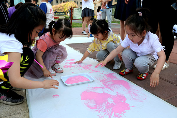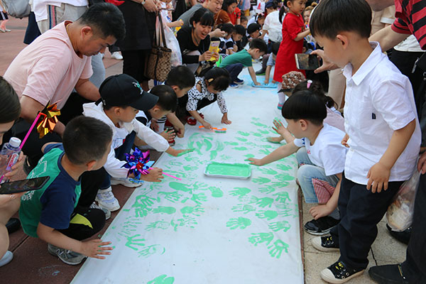 舞蹈結(jié)束后進(jìn)行游戲環(huán)節(jié),為小朋友打造了色彩體驗(yàn)地帶,準(zhǔn)備豐富的色彩顏料,大家可以在現(xiàn)場用手作畫,讓孩子們發(fā)揮想像,盡情的在上面畫出美麗的童真世界。