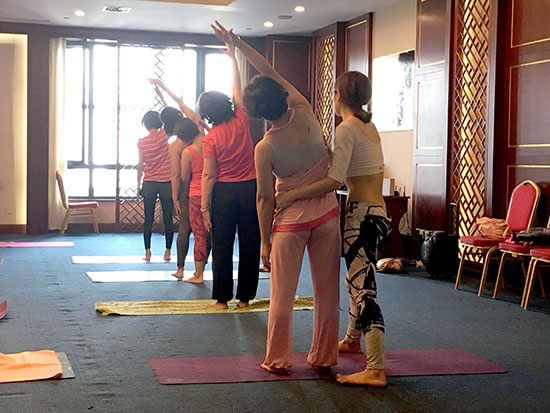 悄悄走近活動(dòng)現(xiàn)場(chǎng),金海大廈三樓大講堂里飄揚(yáng)著舒緩的音樂,伴隨著輕柔的指導(dǎo)聲娓娓?jìng)鱽恚?/span>20多位業(yè)主們正在專業(yè)老師的帶領(lǐng)下學(xué)習(xí)瑜伽動(dòng)作。