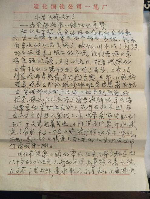 我是溫泉小鎮(zhèn)30號樓的業(yè)主劉桂芳,我家自來水水龍頭壞了,做飯用水成了問題。給日常生活帶來了極大的不便,我們老倆口兒急得焦頭爛額。5月29日,抱著試探的心情找到金海溫泉小鎮(zhèn)物業(yè),說明了情況。接待我們的工作人員劉愛玲非常熱情,一邊安慰我們,一邊把情況向上匯報。當即,物業(yè)經(jīng)理馬越惠立即派維修班班長張景堯和物業(yè)管理部綜管員于文濤來到我家。經(jīng)檢查,是我家的水龍頭壞了,需要更換新的。余文濤把需要的管材寫在紙上,我們立即買回,兩位師傅立即投入緊張工作,張景堯師傅臥倒趴下、于文濤打著手電,不怕臟、不怕累、汗水浸透了衣服維修了一個多小時,終于將水龍頭修好。我們懷著感動的心情,遞上香煙、沏好茶水,卻被兩位師傅婉言謝絕。