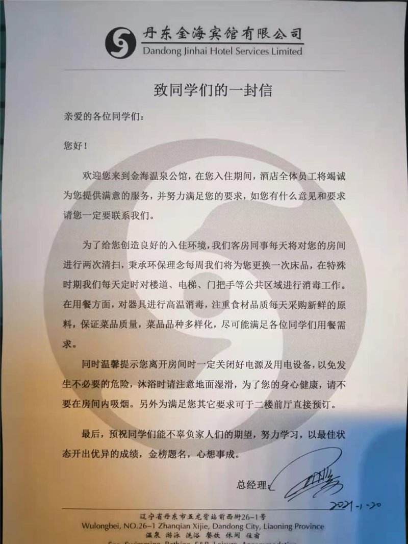 又是一年臨近春節(jié),新冠肺炎疫情再次爆發(fā),給各行各業(yè)造成了不小的沖擊,然爾,金海溫泉公館在這個(gè)特殊時(shí)期卻迎接了一批“特殊客人”——高考學(xué)生。來了,就是丹東人,要讓住在這里的孩子們感受到丹東人的溫暖,金海人的溫暖,這是金海公館這次重要接待的服務(wù)口號(hào)。