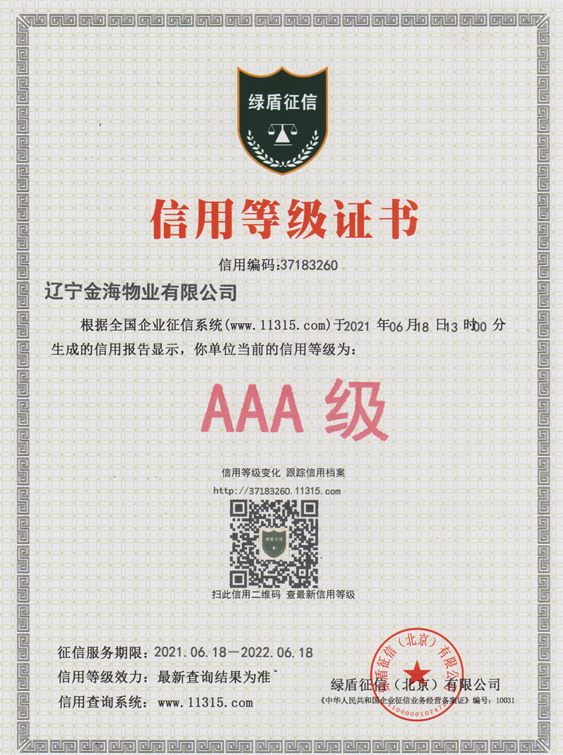 根據全國企業(yè)征信系統(tǒng)于2021年6月18日生成的信用報告顯示,遼寧金海物業(yè)有限公司榮獲“AAA級信用等級”。