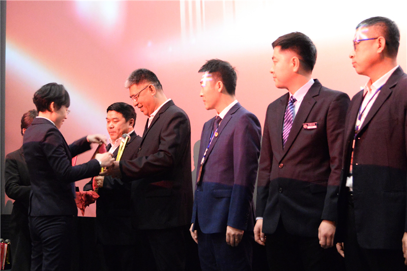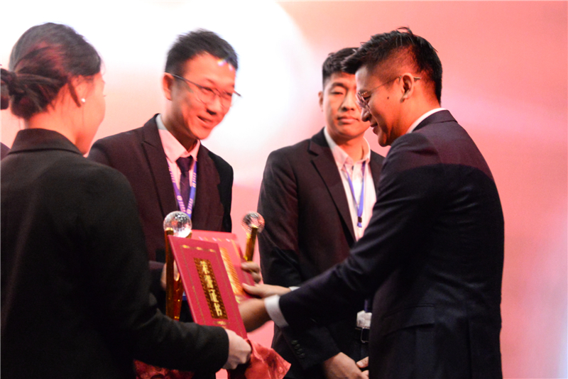 三等獎獲得者上臺領(lǐng)獎,集團副總經(jīng)理劉中為三等獎獲得者頒發(fā)獎杯獎狀